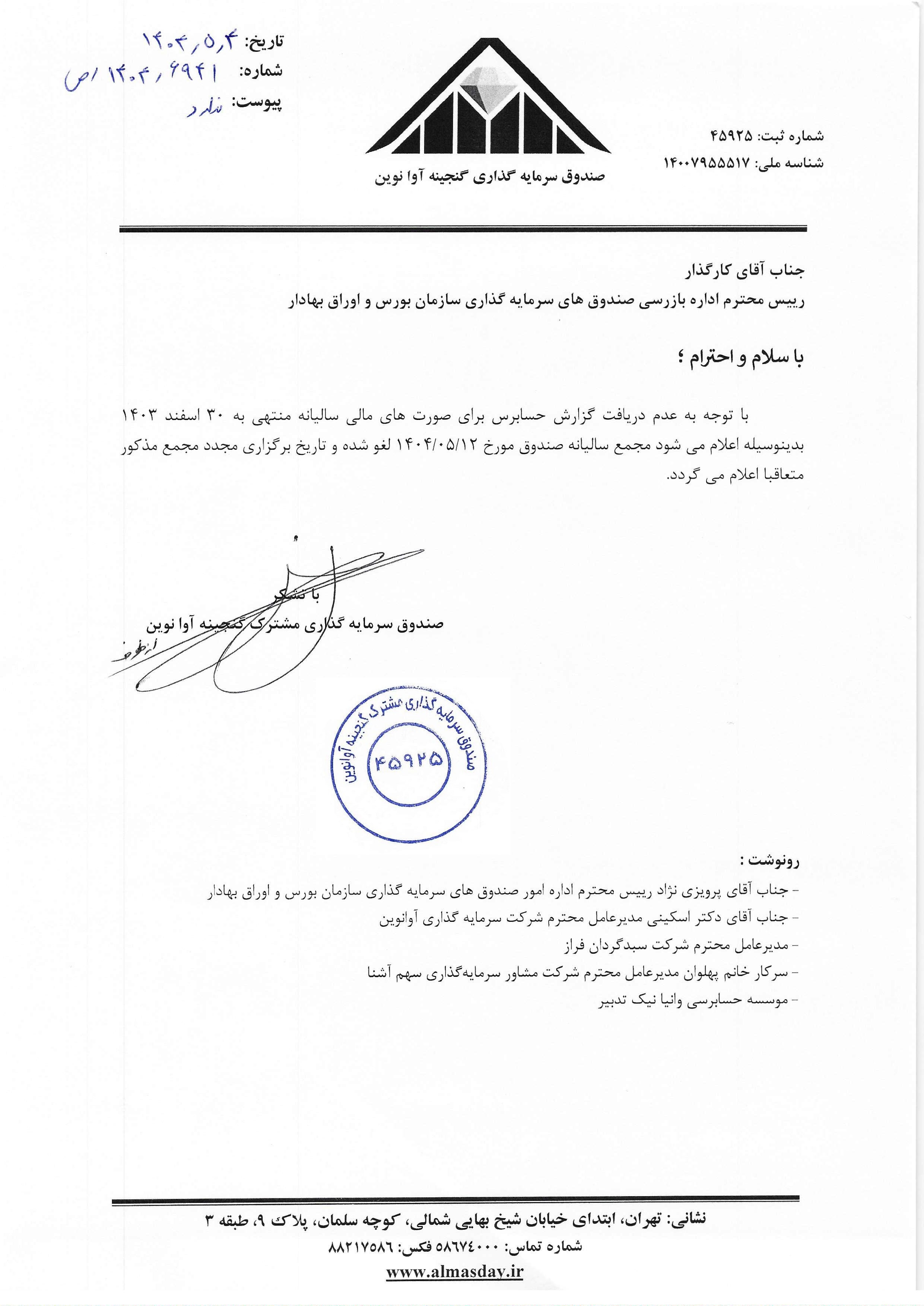 لغو مجمع سالیانه صندوق مورخ 1404/05/12 ساعت 15:00( سال مالی منتهی به 30 اسفند 1403)