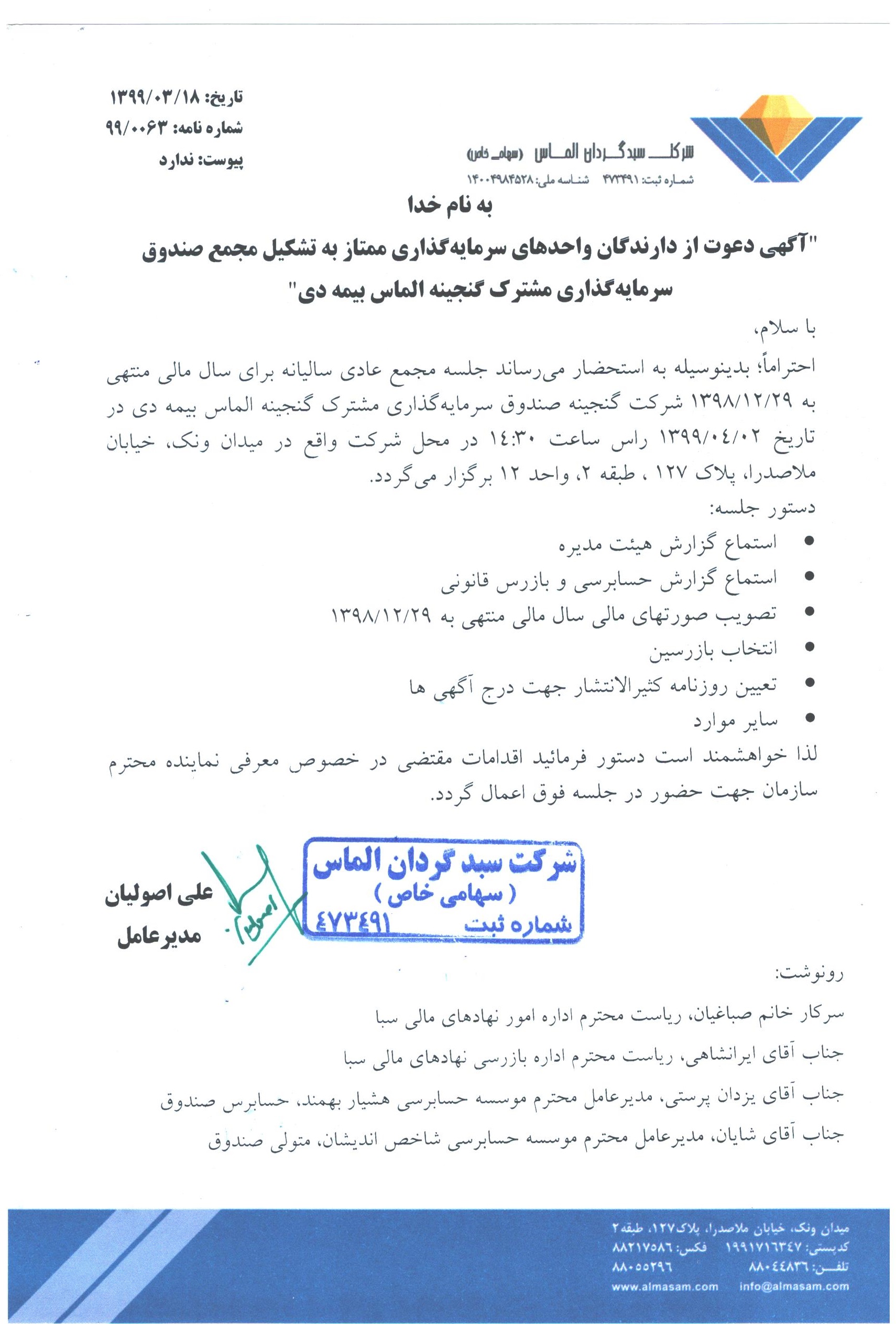 آگهی دعوت به مجمع سالیانه صندوق سرمایه گذاری گنجینه الماس بیمه دی مورخ 1399/04/02