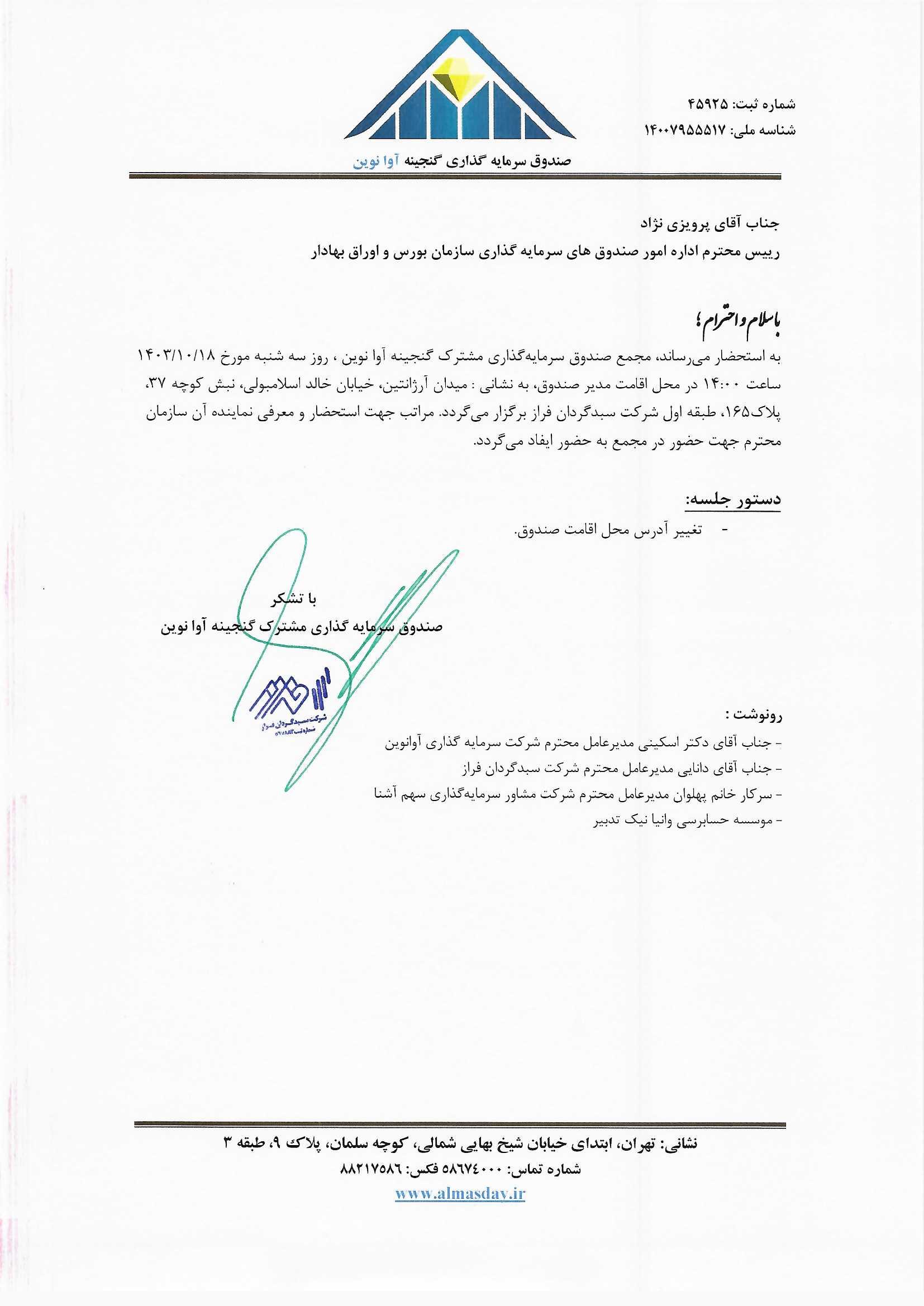 تصمیمات مجمع صندوق مورخ 1403/10/18 ساعت 14:00( تغییر محل اقامت صندوق)