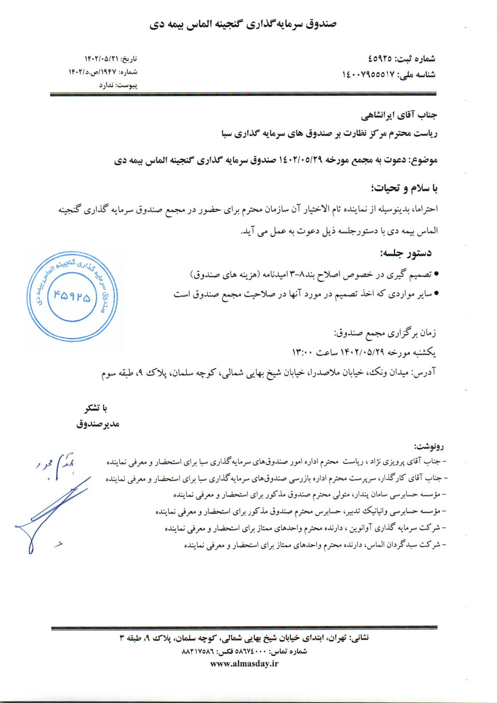 آگهی دعوت به مجمع صندوق مورخ 1402/05/29ساعت 13:00