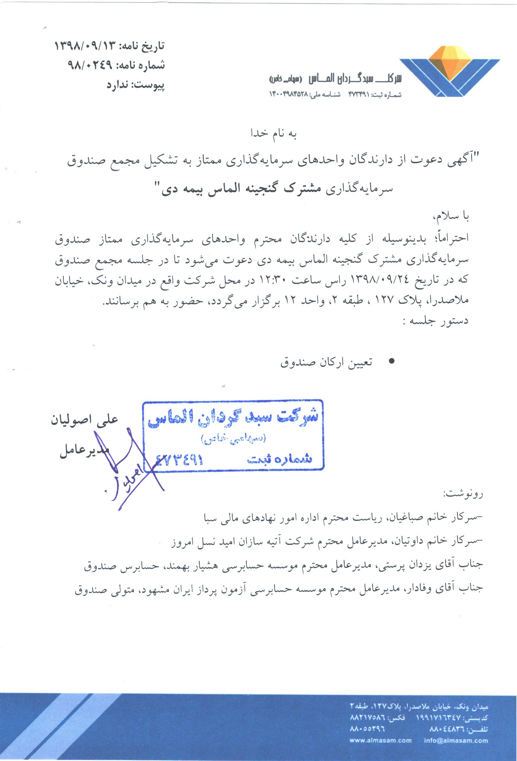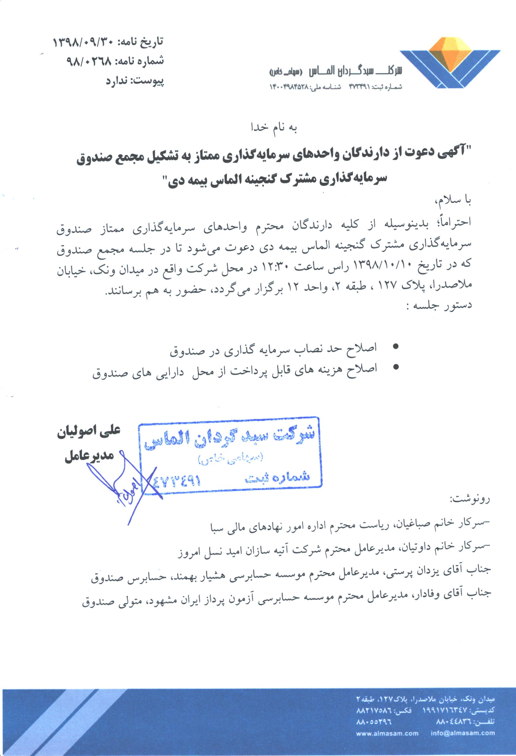 لغو آگهی دعوت به مجمع صندوق مورخ ۱۳۹۸/۰۹/۲۴ساعت ۱۳- اصلاح مفاد امیدنامه
