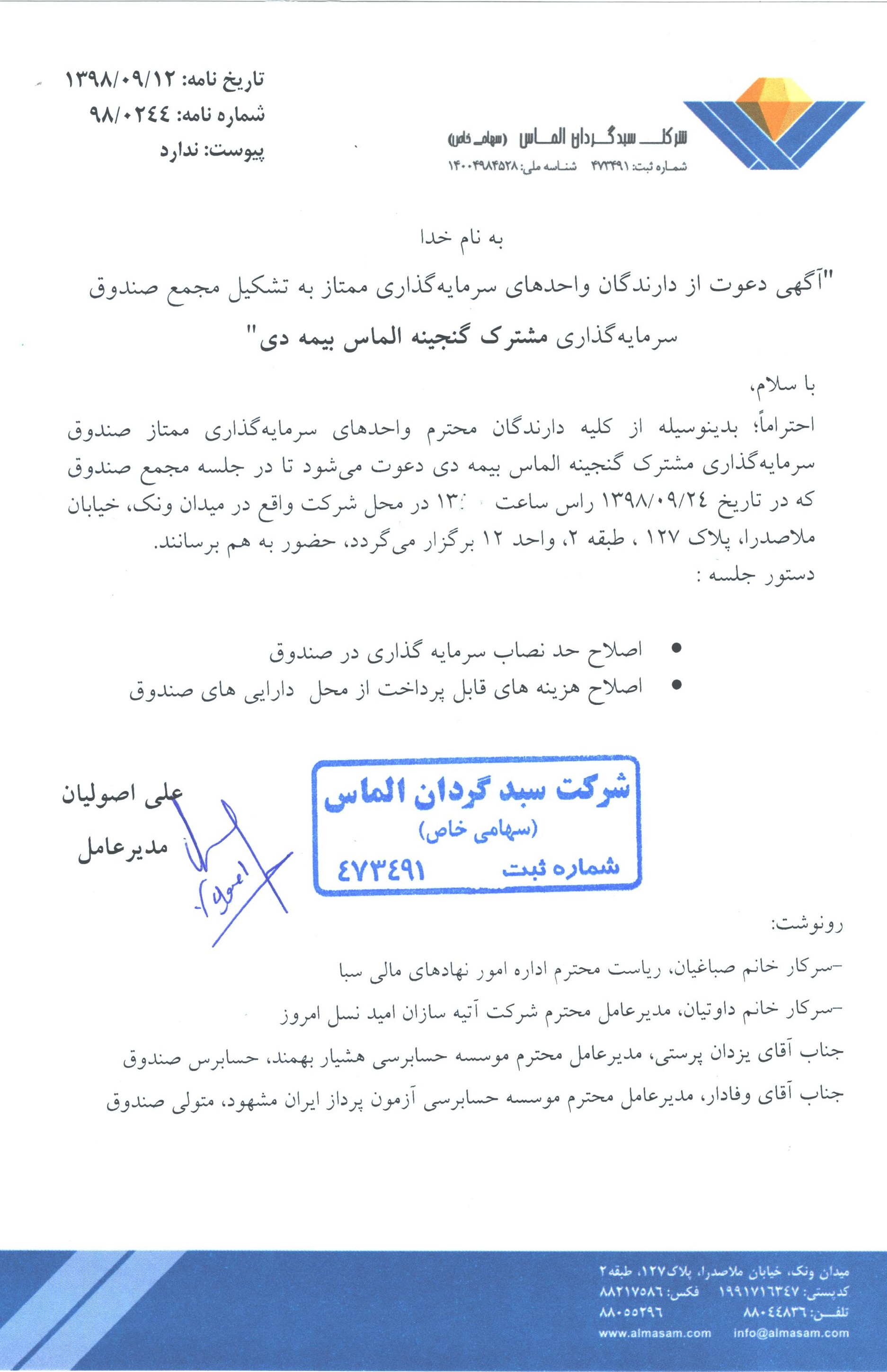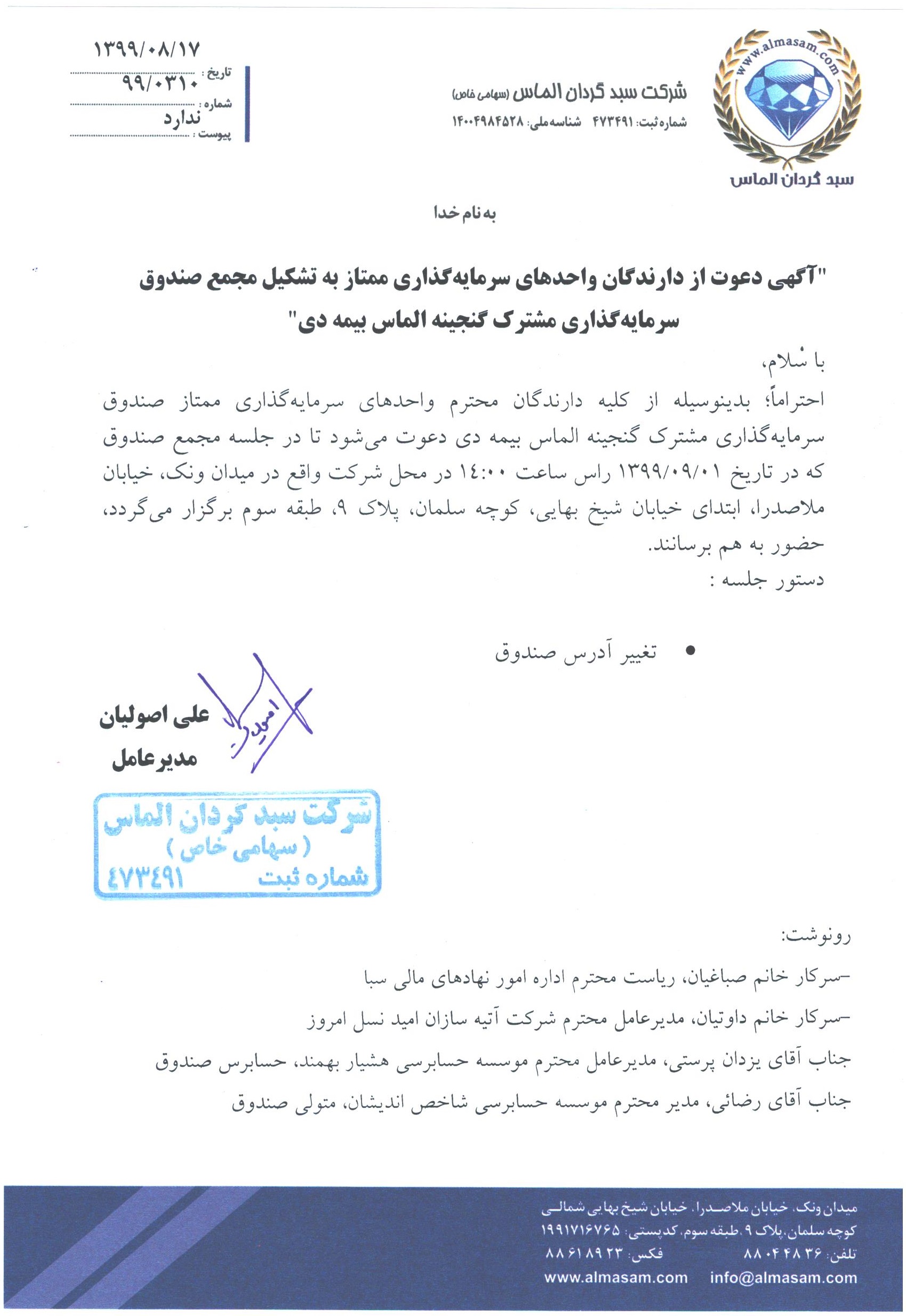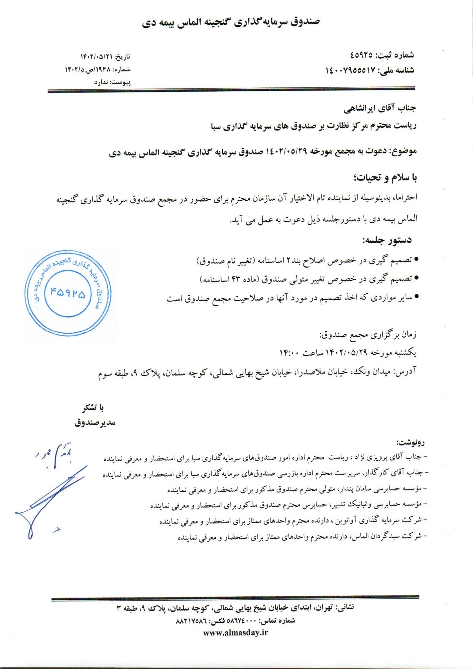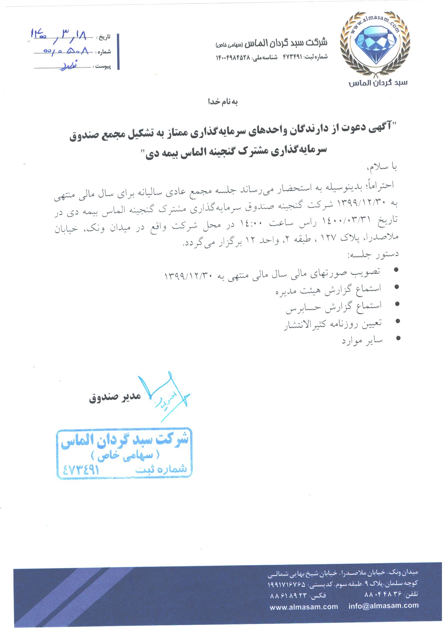 آگهی دعوت به مجمع سالیانه صندوق سرمایه گذاری گنجینه الماس بیمه دی مورخ ۱۳۹۹/۰۴/۰۲