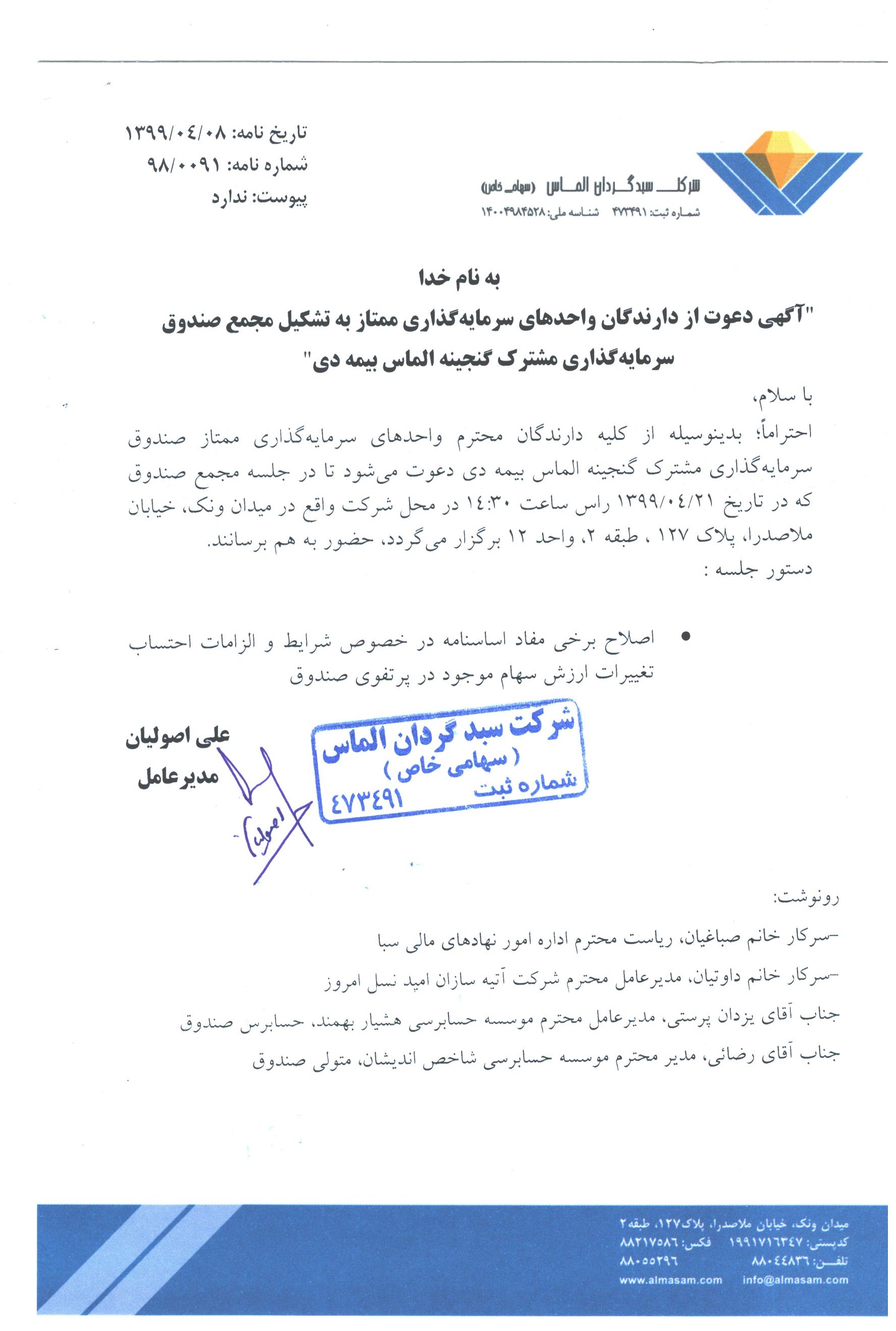 آگهی دعوت به مجمع صندوق مورخ ۱۳۹۹/۰۴/۲۱ ساعت ۱۴-اصلاح امیدنامه